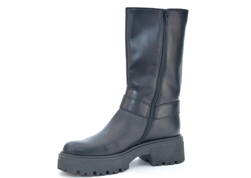 Lätt varmfodrad bikerboots i skinn med guld spännen. Dragkedja på insidan. Klackhöjd ca 55 mm.