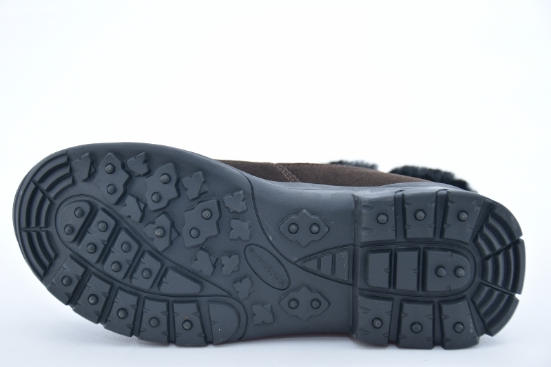 Dubbkänga i mocca med två dragkedjor för att lättare komma i och ur skon. 15 st dubbar i härdat stål. Innerfoder och innersula i fuskpäls. Löstagbar innersula.