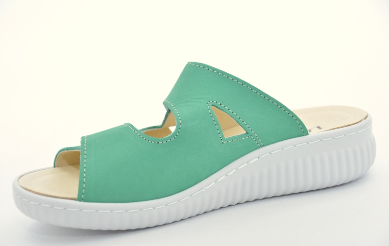 Sandal i skinn med två justerbara remmar. Innerfodret och innersulan är i skinn. Löstagbar innersula.