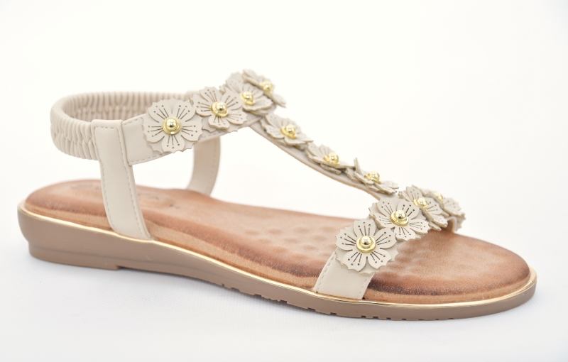 Blommig sommar sandal med mjuk innersula. Hälremmen är i resår för att enklare komma i och ur sandalen.